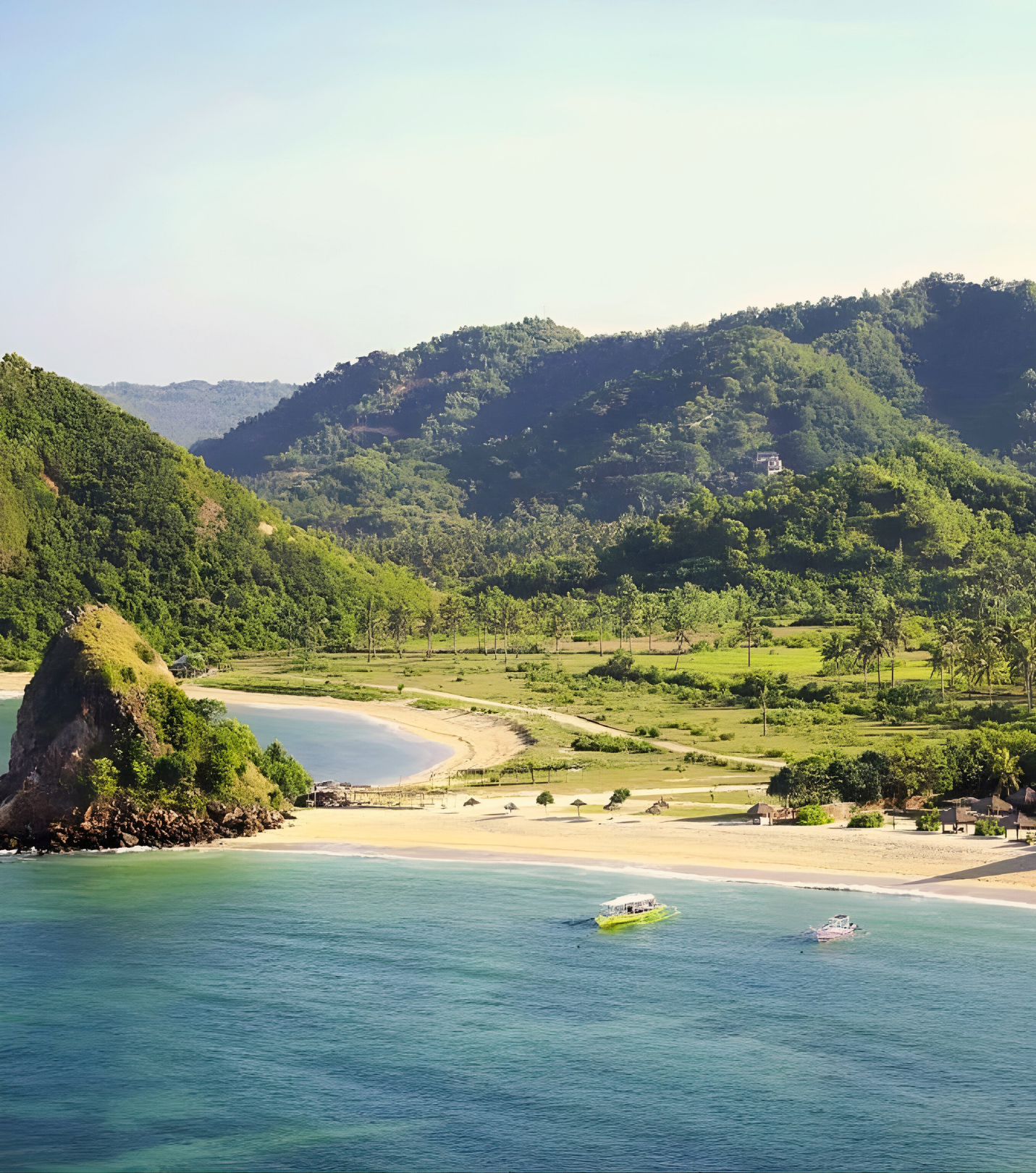 Surrounded by white-sand beaches, turquoise waters, and rolling hills.